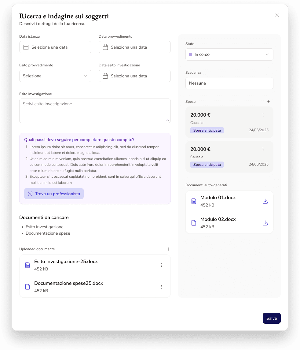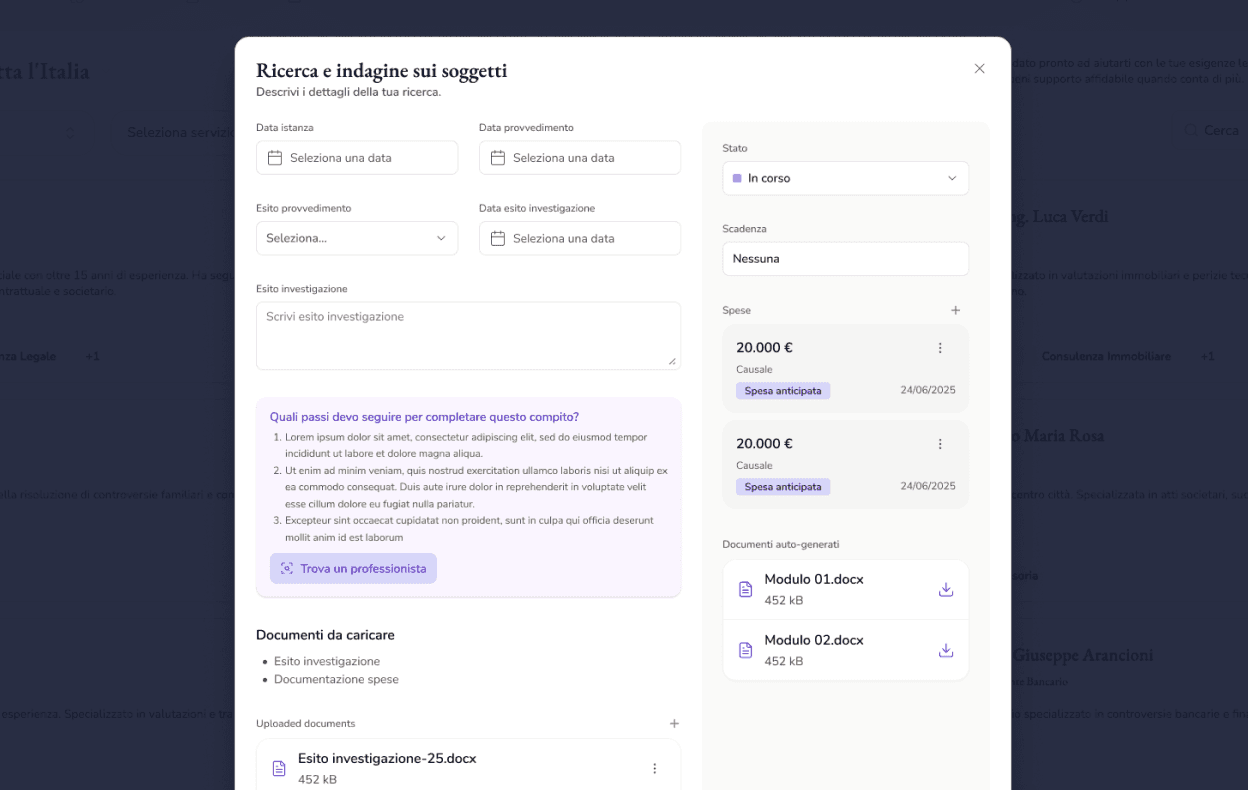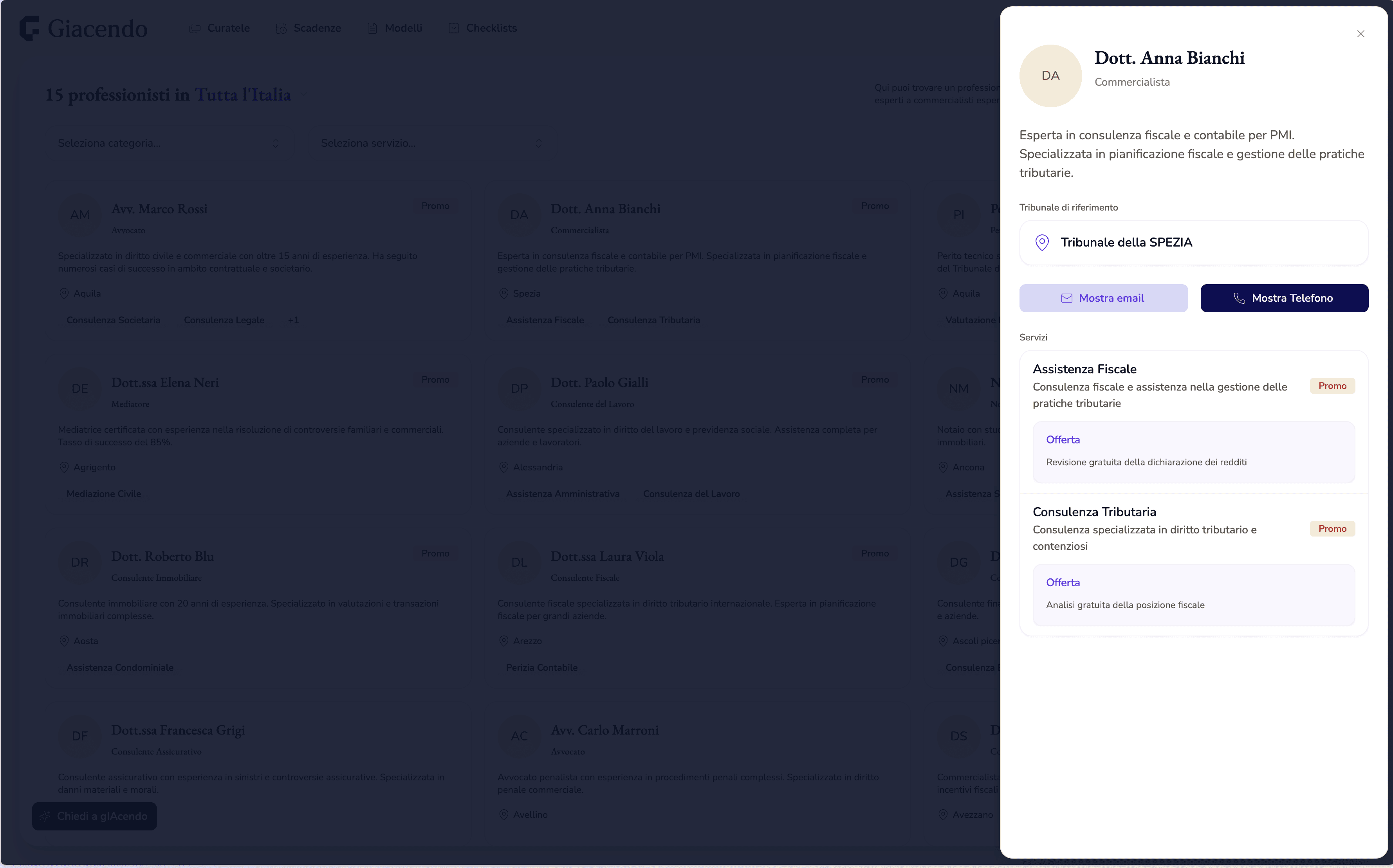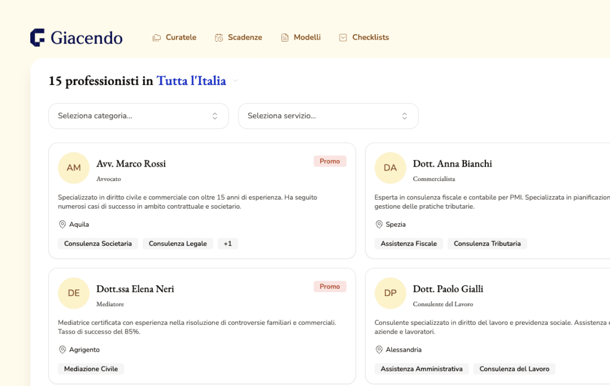 I Giacendo Professional Partner sono professionisti formati e accreditati che collaborano con i curatori in ambiti specialistici: dalla ricerca genealogica, alla gestione patrimoniale, fino agli aspetti fiscali e amministrativi. Ogni area, salvo esclusive, ha da 2 e 4 partner ufficiali per categoria professionale. La concorrenza è limitata al Network Giacendo e ogni professionista presidia un mercato di nicchia, con visibilità garantita verso i curatori iscritti al Network.